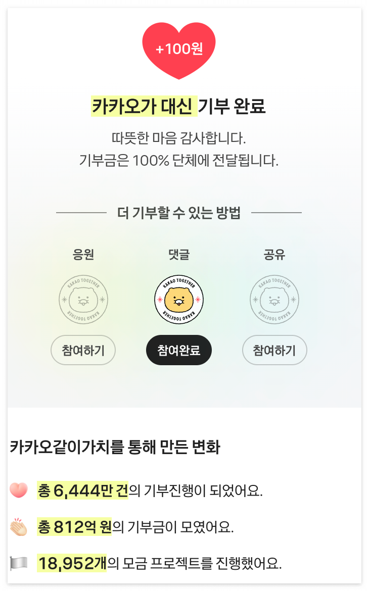 카카오 같이 가치: 댓글을 쓰는 것만으로도 참여기부가 가능한데요, 아래 링크를 타고 들어가시면 됩니다.